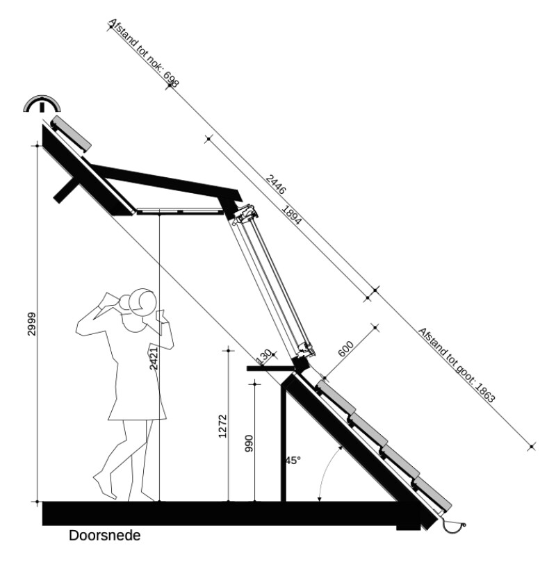 Voor de bouwtekeningen hebben we gebruikgemaakt van SVG's. Omdat SVG’S vector based zijn (een beschrijving van vlakken en lijnen) ipv lijst van pixels (Zoals JPG en PNG). Doordat SVG dus gebaseerd zijn op vectors is het mogelijk om deze afbeeldingen te vergroten/verkleinen zonder kwaliteit te verliezen. De uiteindelijke tekeningen van de dakvlakken en dakkapellen zijn opgebouwd uit meerdere losse SVG’s die op basis van de eerder geleverde input dmv berekeningen de juiste afmeting en positie krijgen. De waardes waarmee de afbeelding wordt bepaald hebben we gekoppeld via Vue aan JavaScript berekeningen. Daardoor krijg je een dynamische afbeelding die je kan laten afhangen van sliders en formulieren.
